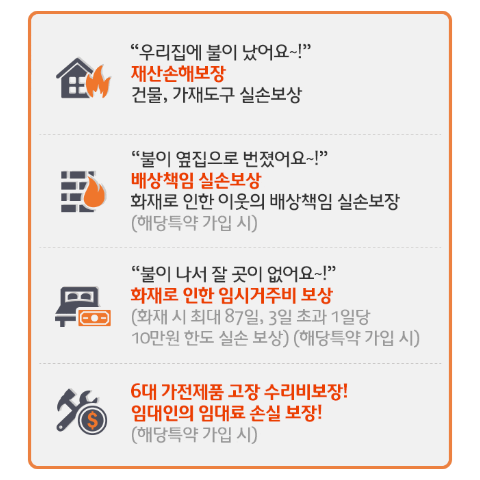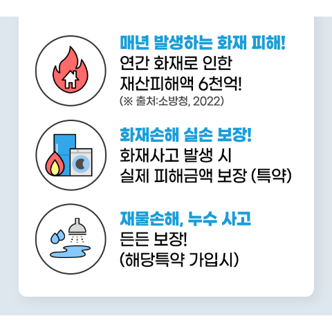 - 생활 안정: 화재 발생 시 경제적인 부담을 줄여주고, 빠른 복구를 통해 안정적인 생활을 유지할 수 있습니다.