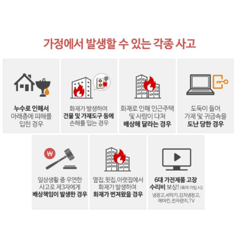 - 예상치 못한 화재 피해 보상: 화재로 인해 아파트 내부의 가구, 전자제품 등이 손상되거나 파손된 경우 보상받을 수 있습니다.